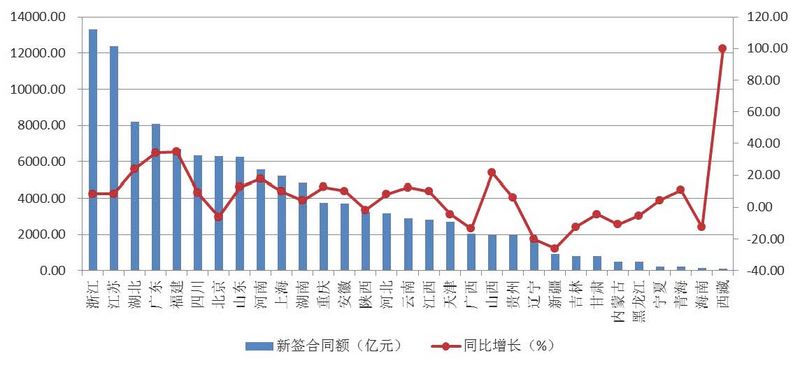 圖3  2018年上半年各地區(qū)建筑業(yè)企業(yè)新簽合同額及增速