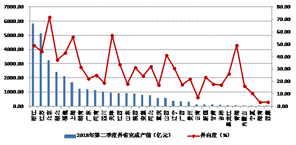 圖4  2018年上半年各地區(qū)跨省完成的建筑業(yè)總產(chǎn)值及外向度